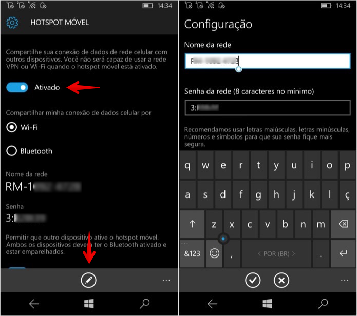 Passo 2. Por fim, para usar o celular como roteador de internet, defina a opção como “Ativado”. Caso queira alterar o nome e senha da rede, basta tocar sobre o botão do lápis, na parte inferior da tela.